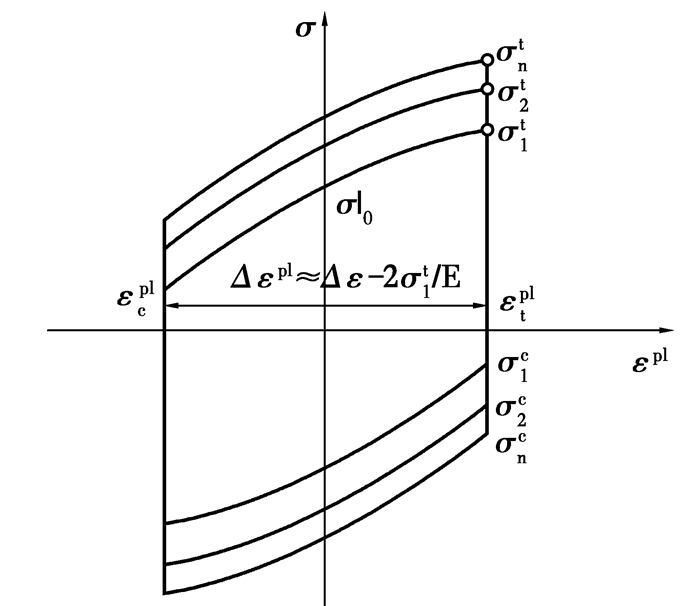 各项同性强化模型参数Q∞、b的取值,参照ABAQUS的帮助文档提供的方法,由对称加载试验数据结合式(2)~(4)[18]拟合而得。选取对称应变控制加载、应变幅为Δε的循环加载试验数据,由于材料的弹性模量相对于强化模量较大,试验可以近似理解为在相同塑性应变幅下的循环加载,如图 3所示,塑性应变幅为Δεpl≈Δε-2σ1t/E。取出n组试验数据点(εipl, σit),各向同性强化屈服面大小即为图 3中点(εipl, σit)与点(εipl, σic)沿σ轴距离的$\frac{1}{2}$,根据式(2)可求得其数值。将塑性应变幅Δεpl代入式(3)转换可得对应于每个屈服面σi0的等效塑性应变$\bar \varepsilon _i^{{\rm{pl}}}$。将此n组数据(σi0, $\bar \varepsilon _i^{{\rm{pl}}}$)根据公式(4)拟合,即可得屈服面最大变化值Q∞和硬化参数b,拟合结果如表 2所示。