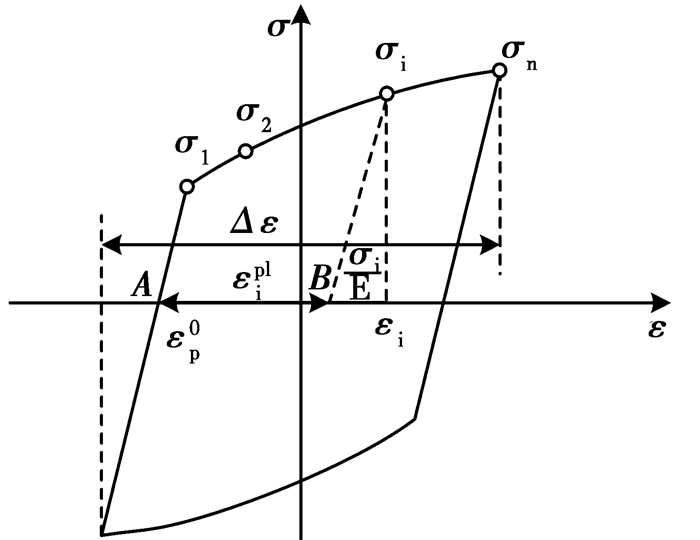 随动强化模型参数Ck和γk的取值,参照ABAQUS的帮助文档提供的方法,由固定应变幅Δε循环加载直到稳态(即本循环和下一循环应力应变曲线形状不再改变)试验数据结合式(5)~(7)[18]拟合而得。固定应变幅Δε循环加载直到稳态所得的稳态循环曲线如图 4所示。以稳态循环曲线上的某个试验数据点(εi, σi)为例,该点相对于点(-εp0, 0)的塑性应变εipl大小等于A、B两点的距离,如图 4所示,按照式(5)可以求得其数值。该点相对于屈服面中心(σ1+σn)/2的应力大小αi可以由式(6)求得。将此n组数据点(αi, εipl)根据式(7)拟合,并经过与第一个数据点(σ1, 0)的准确匹配,即可得随动强化参数初值Ck和随动强化参数减小比率γk。