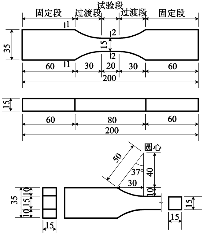 王元清等[4]针对SN490B钢材的循环加载试验试件尺寸如图 5所示,试件由固定段、过渡段和试验段3部分构成。在ABAQUS中建立试验段模型即15 mm×15 mm×20 mm的长方体,单元类型采用8节点六面体线性减缩积分单元C3D8R,指定参考点RP(20, 7.5, 7.5),并将参考点与实体相关联。