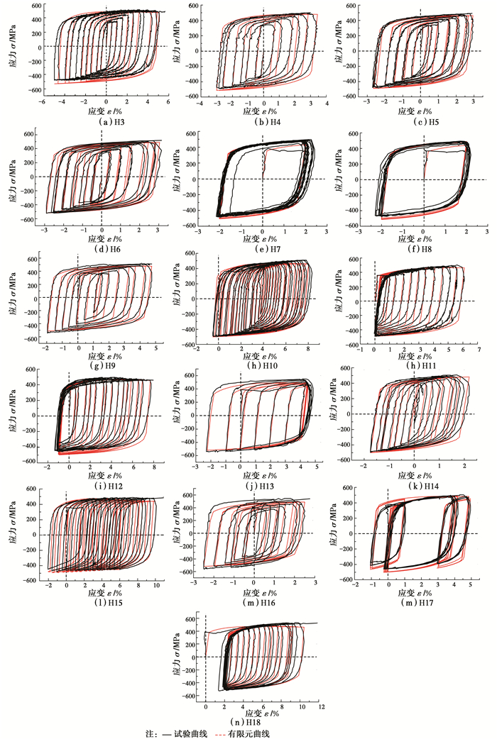 将分析结果绘成应力应变曲线,并与图 6所示16种循环加载制度下实际试验数据绘成的应力应变曲线进行比较,比较结果如图 7所示。
