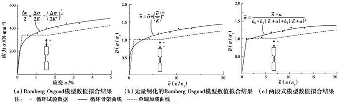 3) 无量纲化前后的Ramberg-Osgood方程可以较好地拟合循环骨架曲线,两段式模型拟合后的骨架曲线分为弹性阶段和循环强化阶段,并包含屈服点,便于后续编程及滞回准则的实现。