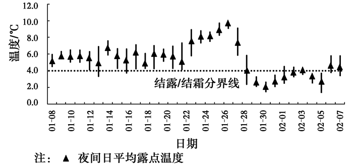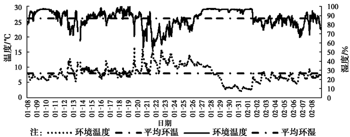 空气源热泵供暖基本工作在夜间(晚上20:00-次日凌晨6:00),为此对夜间运行时间段气象数据(如图 2)进行分析。图 2反映了测试期间(2015-01-08-2015-02-08)白天与夜间的平均温度及温度波动(最高温与最低温之差)对比情况,夜间日平均气温为7.6 ℃,略低于白天(8.3 ℃),而从温度波动角度来看,夜间平均波动为2.2 ℃,最大为4 ℃(晴天),最小为0.7 ℃(阴雨天),而白天温度波动为3.5 ℃,最大波动达9.1 ℃,整体来看,夜间温度要稳定得多。