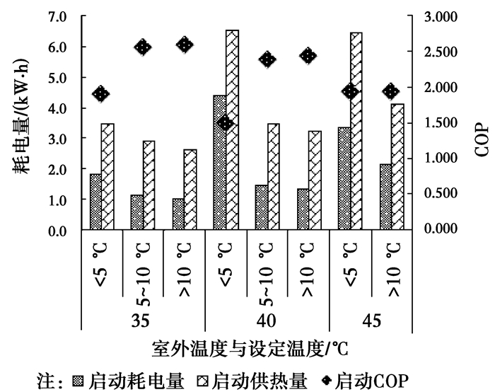 此外,影响启动阶段COP的因素还有室外温度。图 10所示为固定初始温度在20 ℃左右,不同室外温度与设定温度下,启动阶段系统的耗电量、供热量与启动COP情况。