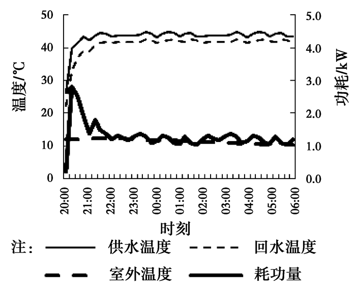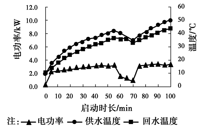 空气源热泵夜间供暖的整个运行过程,按照供水温度是否达到设定温度将其分为启动阶段与稳定运行阶段。空气源热泵系统性能分析主要包括系统供回水温度、系统耗电量、供热量以及系统COP等的分析。