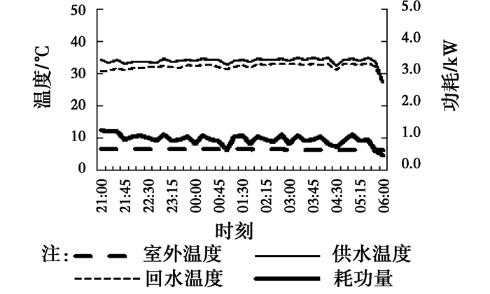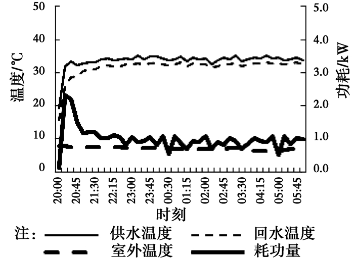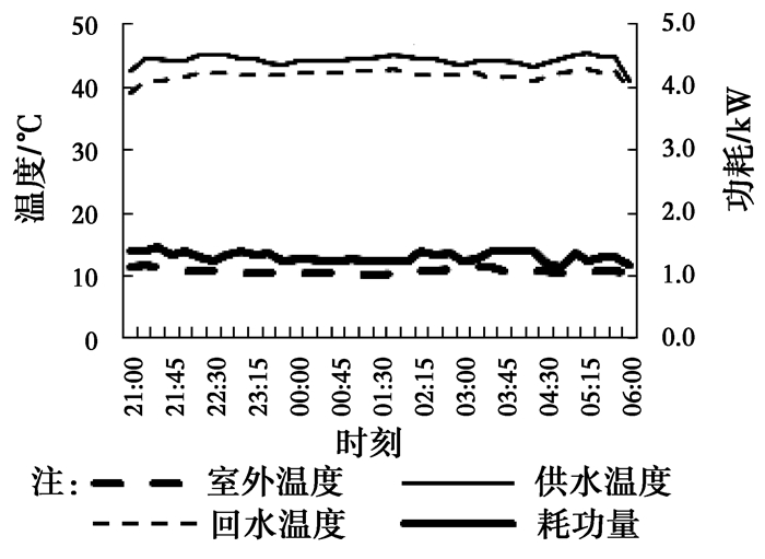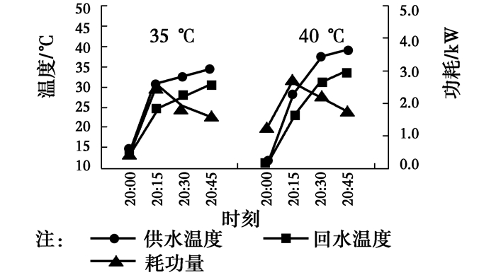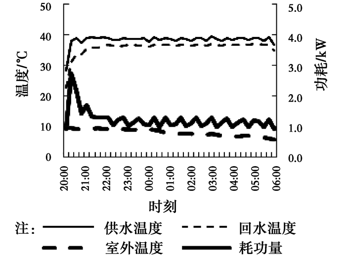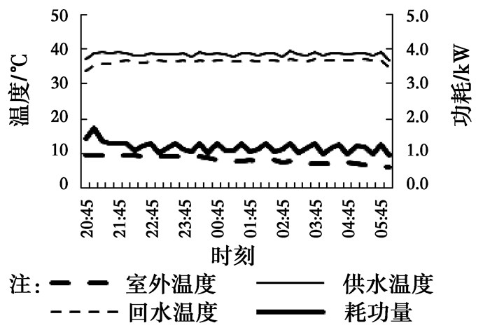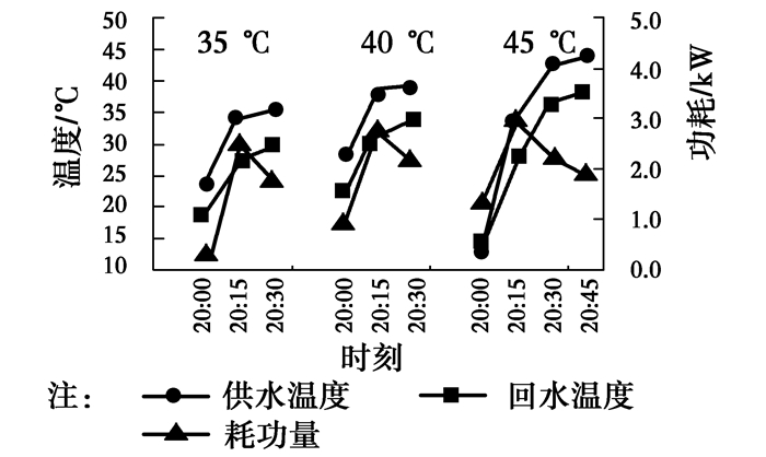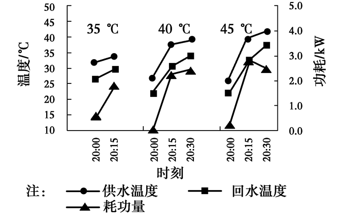 图 14~16为不同设定温度下,系统稳定阶段供回水温度及耗功量的变化情况。由图 14~16可见,室外温度在整夜变化不大,供回水温度变化同步,且波动不大,但是随着供水温度的升高有上升趋势,35、40、45 ℃对应的平均温差分别为1.8、2.1、2.4 ℃,主要是设定温度提高后,供热量增加,在流量变化不大的情况下,供水温差有所增加。从耗功量角度来看,设定温度越高,需要提升的温度越高,耗功量相应加大。