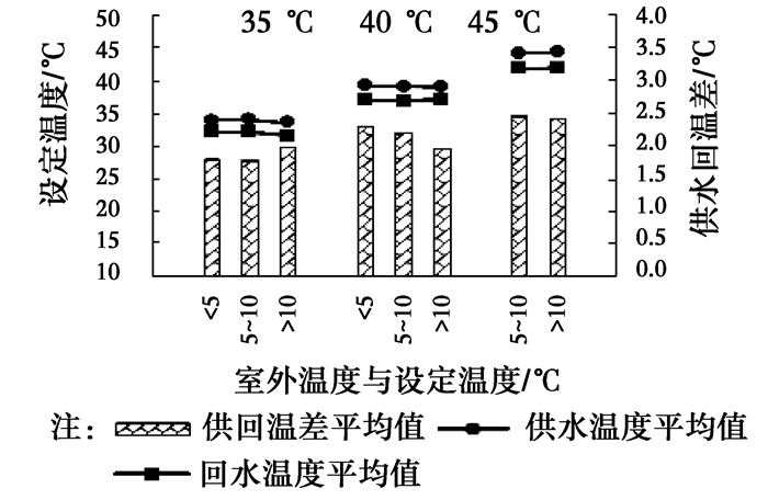 图 17为不同设定温度下供回水温差的变化情况。由图 17可以看出,同一设定温度下,供水与回水温度在不同室外条件下相差不大,但是均没有达到设定温度,这与管路沿程热损失有关。从供回水温差来看,设定温度为45 ℃时,供回水温差要高于35 ℃与40 ℃时,设定温度越高,提供给末端热量越多。