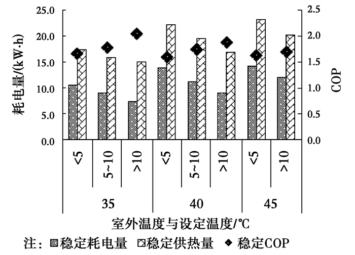 从稳定阶段COP角度来看,当设定温度为45 ℃时,室外温度在5~10 ℃,稳定COP为1.628,随着设定温度的降低,COP提高,在40与35℃时,分别提高至1.746与1.771,提高了7%与9%。当室外条件逐渐变好至10 ℃以上时,设定温度45 ℃,COP提高为1.693,降低设定温度对COP的增强效果明显,分别增加了11%和20%。即室外温度提高时,降低设定温度对COP的提升有明显加强作用。由于时间上远远大于启动阶段,所以耗电量远远大于启动阶段耗电量,COP总体上来说较启动阶段低,稳定阶段COP的改善更值得关注。