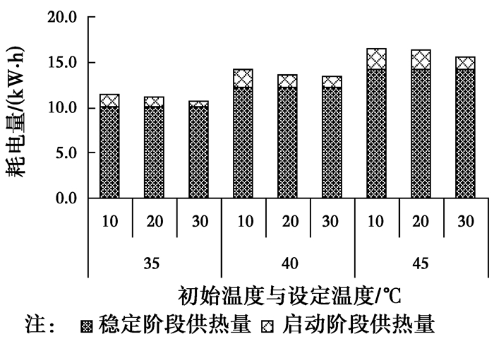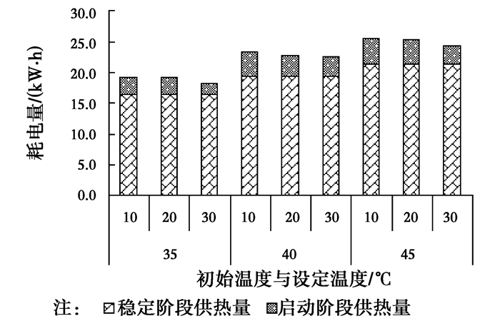首先从耗电量角度来看,初始温度为10 ℃时,35 ℃供水的耗电量1.4 kWh,分别为40、45 ℃的68%、61%;而当初始温度提高为30 ℃时,就只有0.59 kWh,分别为40、45 ℃的51%、43%,初始温度的提高,使得耗电量下降较初始温度10 ℃时更明显。