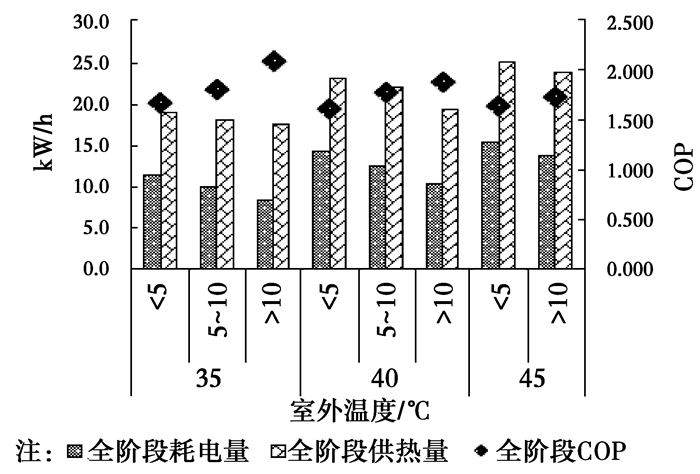 室外温度小于5 ℃时,35 ℃供水的耗电量为1.823 kWh,设定温度提高至40 ℃,耗电量将急剧升高,增加了一倍多,主要是在温度很低时,热泵系统室外机结霜,可以预见的是,设定温度继续升高,耗电量将进一步加大。而当室外温度提高至10 ℃以上,35 ℃时耗电量为1 kWh,设定温度提高至40、45℃时,分别增加了0.3倍与1.1倍。即,室外温度增加后,提高设定温度,耗电量增加变缓。供热量同样是在趋势上与耗电量保持一致。在结霜条件下,供热量也会急剧增加,与耗电量共同作用,使得COP下降很剧烈。
