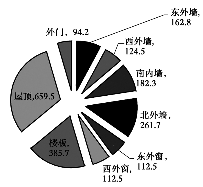 热泵冬季夜间运行过程中,为了维持室内一定温度,需要满足供热量等于耗热量,耗热量主要包括两部分,即围护结构对流换热量以及由于气密性差异所带来的冷风渗透耗热量。该实验台与文献[14]为同一试验台,根据其实验可知,供水温度在35 ℃以上时,室内均能达到16 ℃以上,对于设定温度为40 ℃时,整夜供热量可达23.115 kW·h,稳态计算得供暖整夜通过围护结构基本耗热量见图 25,图中耗热量单位为W。