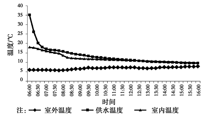 由此可估算出房间换气次数约为1.4 h-1,建筑气密性能远低于城镇建筑0.5 h-1的性能水平。图 26为全阶段早上6:00供热停止后,供水温度、室内温度以及室外温度的变化情况。