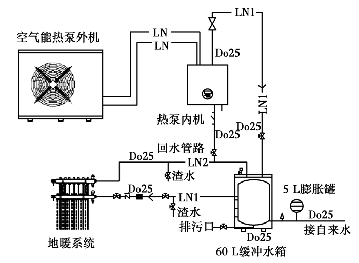 图 5为空气源热泵供热系统图,供暖系统主要包括空气源热泵主机、热泵内机、缓冲水箱以及毛细管辐射采暖末端。