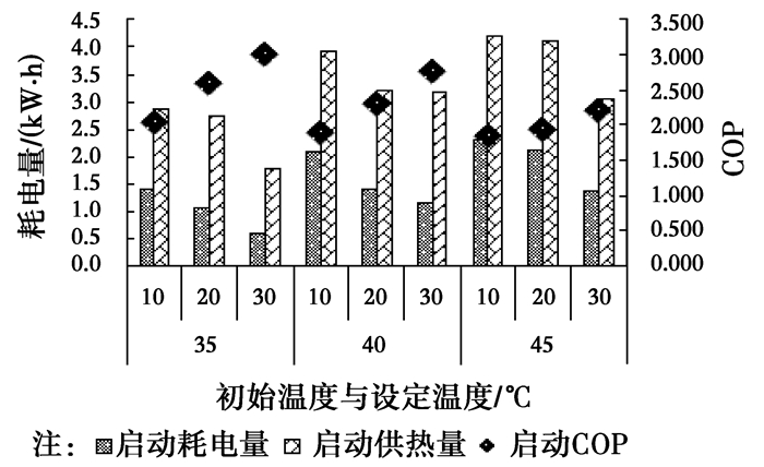 为了研究系统启动阶段特性,定义启动阶段COP为启动阶段总供热量与启动阶段总耗电量之比。图 9为启动阶段不同初始温度与设定温度下,系统的耗电量、供热量与启动COP情况。