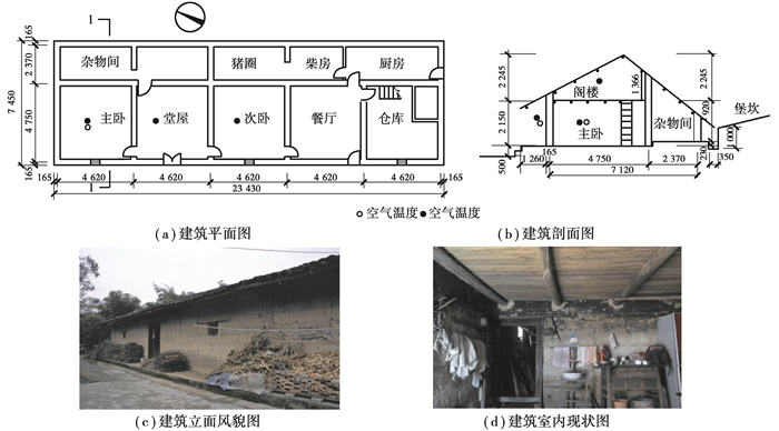 在村中选取一户居住者充分使用、且具有典型代表性的传统民居作为研究对象。该建筑有80多年历史,朝向为南偏西65°。据考证是全村最老的建筑,5开间,坡屋顶,木门窗,夯土墙,保存相对完好。建筑风格质朴,属于典型的巴渝民居,建筑平面功能简单,除堂屋外,其他房间均设有阁楼。建筑平面、剖面以及立面风貌见图 1。