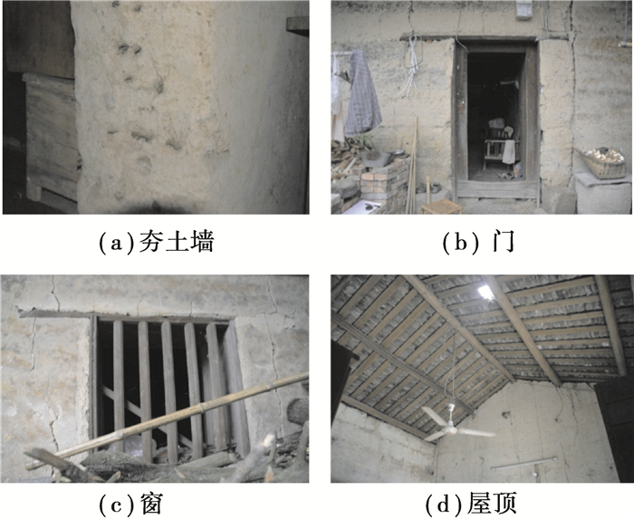 建筑主要围护结构做法为:室内外墙体均采用350 mm厚夯土墙,墙体为就地取土,加上秸秆段人工夯筑而成,见图 2(a);地面素土夯实;屋顶采用传统木结构屋顶,上覆盖小青瓦,采用亮瓦顶部采光;见图 2(d);建筑门窗均为木质,窗仅为木格栅洞口。见图 2(b)、(c)。