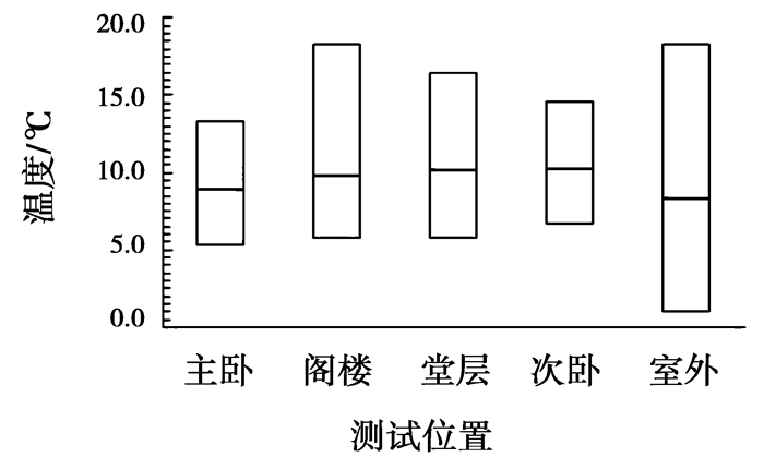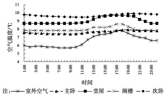 为了逐时分析一天中室内气温的变化,选择测试时间段中室外平均温度最低且较稳定的1月2日作为典型天进行分析,典型天温度变化见图 5。该天室外日平均气温为6.6 ℃,昼夜温差为2.2 ℃。建筑内部空间中,热环境最好的是次卧,平均温度9.7 ℃,其次是与之位置相似的堂屋9.1 ℃,最低是主卧7.7 ℃,阁楼略高于主卧。