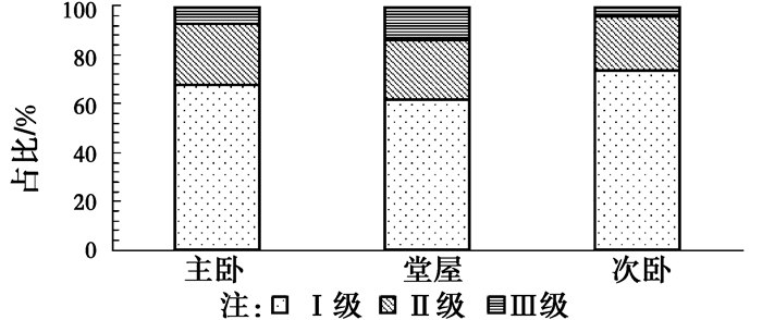 选择最能代表重庆夏季的7、8两月计算室内主要房间的APMV,各功能房间达到不同等级的比例见图 9。