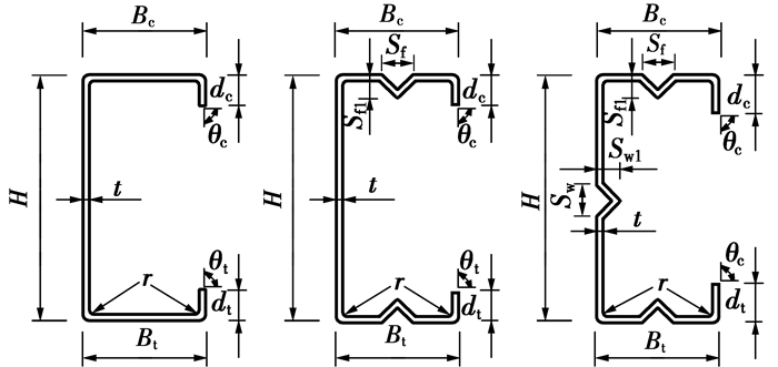 试件采用镀铝锌钢板加工制作而成,钢板名义厚度t=1.2 mm。试件的腹板高H=160 mm,翼缘宽B=80 mm。每种截面形式的短卷边和长卷边分别为10、30 mm。V形加劲肋两板件间夹角为直角,加劲肋高度Sf1=Sw1=10 mm,宽度Sf=Sw=20 mm。