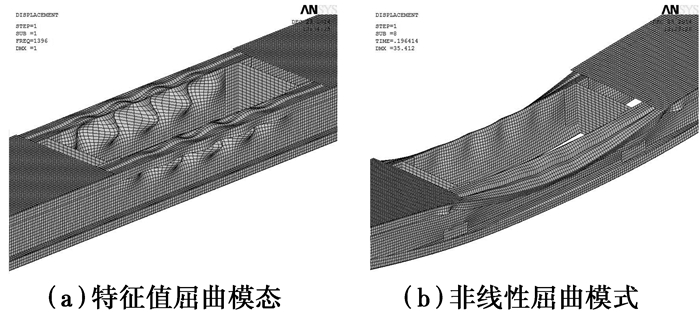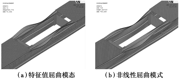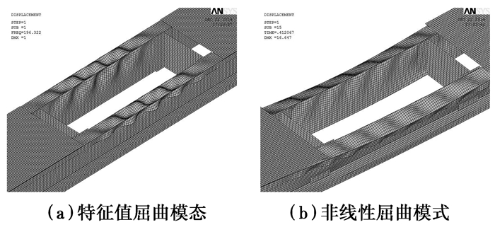 有限元参数分析发现:短卷边构件在特征值屈曲分析中表现为畸变屈曲,在非线性分析中一般以畸变屈曲为主(见图 8);长卷边构件在特征值屈曲分析中表现为局部屈曲,在非线性分析中表现有所不同,其中:翼缘V形加劲以及翼缘和腹板V形加劲构件表现为局部和畸变的相关屈曲(见图 9),无V形加劲构件表现为局部屈曲(见图 10)。