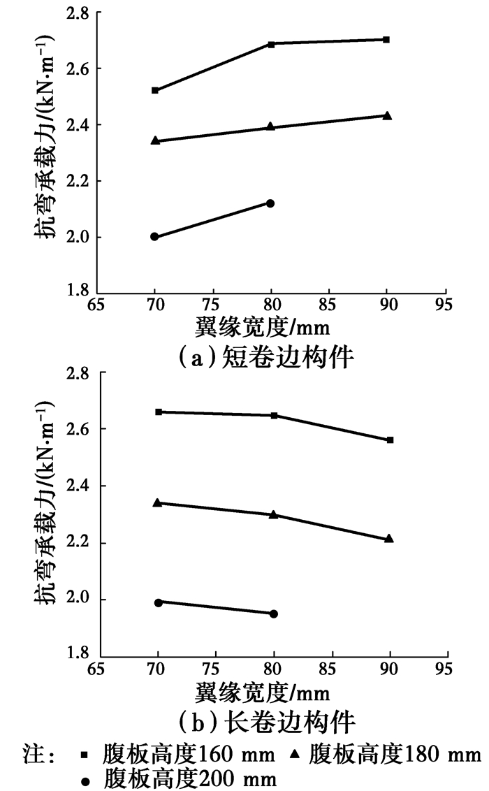 有限元参数分析抗弯承载力结果列于表 3中。从表 3结果可以看出与试验结果相同的规律,同种卷边宽度情况下,无V形加劲构件最低,翼缘V形加劲构件次之,翼缘和腹板V形加劲构件抗弯承载力最大。构件抗弯承载力的变化规律与屈曲模式有关,当发生畸变屈曲或局部和畸变的相关屈曲时,多数构件抗弯承载力随着翼缘宽度增加而增加(见图 11 (a));当发生局部屈曲时,构件抗弯承载力随着翼缘宽度增加而减小,如无加劲长卷边试件(见图 11 (b)),这是由于无加劲长卷边构件受压翼缘发生了局部屈曲,板厚相同时构件随着翼缘宽度的增大容易出现局部屈曲。