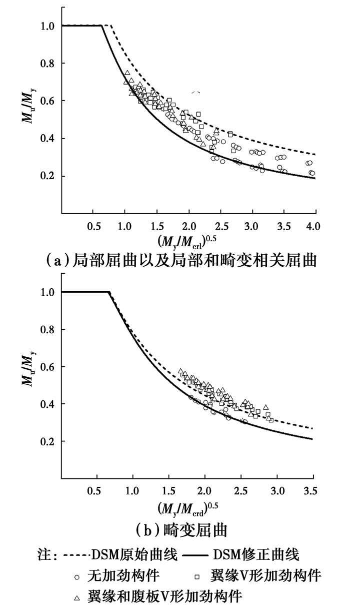 图 12(a)所示为发生局部屈曲以及局部和畸变相关屈曲的散点分布情况,可以看出3种加劲形式构件的散点分布大多数位于原始DSM曲线的下方,说明原始曲线偏于不安全,需对其进行修正。分析认为,相对于普通冷弯薄壁型钢而言,高强冷弯薄壁型钢厚度更薄,板件宽厚比更大,构件更易于发生局部屈曲失稳破坏,这使得发生局部屈曲以及局部和畸变相关屈曲的构件抗弯承载力Mu相对较小,在截面边缘屈服弯矩My一定的情况下,图 12(a)中纵轴值也即Mu与My的比值Mu/My相对较小,最终导致构件的散点分布大多数位于原始DSM曲线的下方。