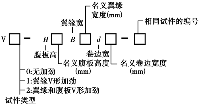 试件截面形式如图 1所示,选取了3种板件加劲形式,分别为无V形加劲、翼缘V形加劲以及翼缘和腹板V形加劲。每种板件加劲形式根据卷边宽度分别为短卷边和长卷边2组试验,共计6组试验。每组试验有截面相同的2个试件。