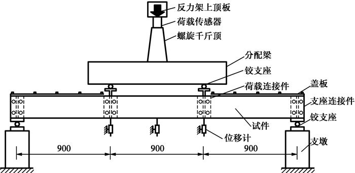 试验采用三分点加载。试件长2 820 mm,中间900 mm的纯弯区段为试验的研究区段,为了防止两侧非纯弯区段的影响,在非纯弯段受压翼缘加设厚为6 mm的盖板,盖板与试件受压翼缘通过高强螺栓相连。图 3所示为试验加载装置,利用螺旋千斤顶手动加载,每级加载量及试件极限承载力可通过传感器的读数获得。