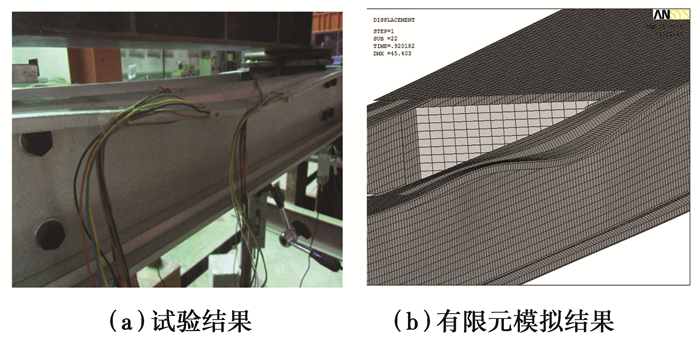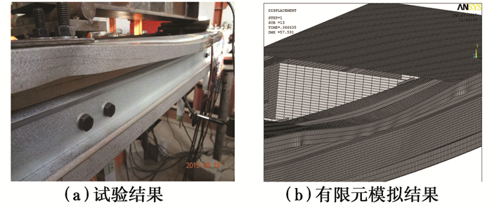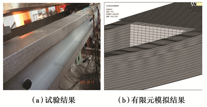 由于短卷边对翼缘发生畸变屈曲的约束作用较弱,所有短卷边试件均发生了畸变屈曲,如图 4(a)所示;由于长卷边对翼缘的约束作用较强,无加劲长卷边试件发生了局部屈曲,如图 5(a)所示;对翼缘V形加劲以及翼缘和腹板V形加劲长卷边试件来说,由于翼缘加劲提高了板件的局部屈曲临界应力,试件发生了局部与畸变的相关屈曲,荷载作用点附近的受压卷边发生了局部屈曲,同时, 试件受压翼缘与卷边的交线不再保持原有的直线状态,即试件有畸变屈曲出现,如图 6(a)所示。