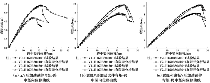 1) 试验研究结果表明,板件加劲形式是影响受弯试件屈曲模式和承载力的重要因素。与无加劲形式相比,板件V形加劲有效减小了板件的宽厚比,提高了35%~65%的抗弯承载力,且翼缘V形加劲比腹板V形加劲能够更有效地提高试件抗弯承载力,有限元结果与试验结果吻合良好。