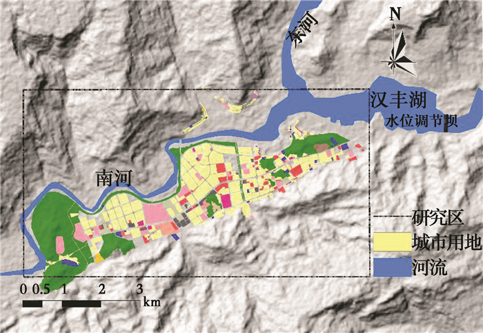 开州区位于重庆市东北部,地处长江三峡腹地、大巴山南麓,是典型的山地城市,也是因三峡水库淹没而新建的城市(图 1) 。介于北纬30°49′30″~31°41′30″、东经107°55′48″~108°54′之间,西邻四川省开江县,北接城口和四川省宣汉县,东毗云阳县和巫溪县,南邻万州区。开州属于小江流流域上游,城区南北被山川环绕,南河自西向东,东河由北向南,在城区交汇。城区以东3 km处的水位调节坝竣工后,在城区内形成了水面达14.8 km2的汉丰湖,库容约8 000万m3。近年来,重庆市的高温均位于开州城区,城市热岛现象凸显,笔者将开州城区的建成区作为研究区,其面积为41.94 km2。由于是移民新城,各项资料齐全,便于开展研究,而且典型的山水格局对于重庆市乃至其他山地区域的城市热岛研究都具有代表性。