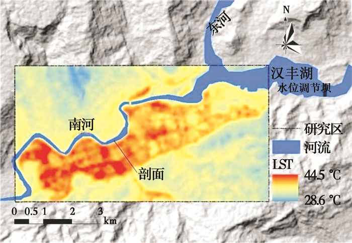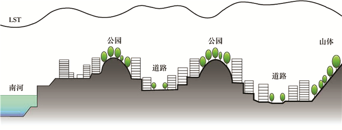 从统计分析结果中可以发现,在局部范围内LST差异性显著,这说明在较小的尺度内,LST更容易受局部环境内水体、绿地、气流等方面的影响。研究区西、北被河流所环绕,东、南被山峦所阻隔,由于水体与绿地具有较好的降温效果,因而沿河带与沿山带用地内的LST相对来说均偏低。提取LST与土地覆盖/利用(LUCC)(图 2) 制作剖面图(见图 7)发现,LST随地形起伏而变化,在城市中相对低凹的平坦地带,由于较高的城市建设强度以及较少的绿地,使得这一区域的LST明显要高于其他区域。此外,相对于道路周边高密度的建筑肌理,开阔的城市道路形成了通风廊道,有利于地表的散热,道路地段的LST有了一定程度的降低。因此,局部的绿化、建筑密度和高度组合、通风廊道的通畅化等方面的改造或优化,可以在一定程度上缓解城市热岛效应。
