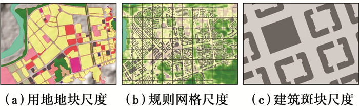 鉴于空间相关性的强烈作用[15, 18],分别基于用地地块、规则网格和建筑斑块等3个空间尺度(图 3) ,利用ArcGIS 10.2提取建设强度与LST样本,然后在SPSS中进行数据相关性分析,揭示建设强度指标与LST之间的相关性及其显著性,分析建设强度对LST的影响机制。