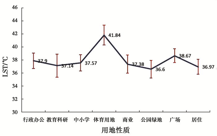 城市用地性质是决定地块内建设强度和人们活动方式的重要因素之一。由于城市下垫层面对LST作用显著且直接[28],各类用地的平均LST有较大差异(图 4)。体育用地下垫层面主要为水泥、沥青、金属等不透水面,平均温度最高(41.84 ℃);广场用地具有类似的下垫层面,其平均温度(38.67 ℃),仅次于体育用地;公园绿地内大部分是透水面,而且树木的蒸腾作用具有很好的降温增湿效果[13-14],因而绿地内的平均温度最低(36.6 ℃);同样,由于居住用地大多具有较高的绿地率,LST(36.97 ℃)也相对较低。各用地内平均温度的方差显示,教育用地的方差最大(1.79 ℃),缘于教育用地内透水性下垫面与不透水下垫面的差异明显,教学区具有较高的绿化,运动区基本没有绿化,导致了局部LST差异显著;其次是商业用地LST方差(1.39 ℃),商业用地大多处于城市道路与居住、行政等用地之间,LST受道路等周边环境影响较大。不同的城市用地性质,具有不同的热环境效应[6],某一类用地性质,其内部的功能安排和使用方式,也对LST有较大的影响。