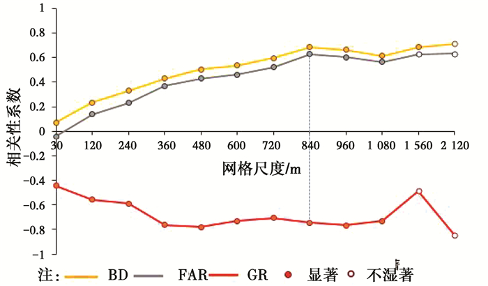 参照有关研究成果[30],按照120 m的尺度间隔逐渐增加网格尺度,形成11个尺度序列,在每个尺度上计算建设强度指标并提取LST平均值,得到相关性结果如图 5。LST与各建设强度指标之间的相关性随采样网格的尺度增加而逐渐增强,并在840 m达到最大值,样本的数量由7 372对(30 m)下降到7对(2 120 m),其后的相关性从1 560 m开始变的不显著。这个变化趋势表明,利用Landsat研究城市热岛或者热环境时,840 m可能是一个最佳尺度。