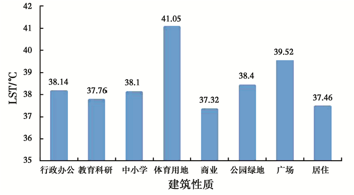 建筑性质决定了建筑的使用类型,并影响了建筑的使用强度。在传统观念中,商业、办公等大体量且高强度使用的建筑会产生大量的人为热并导致其周围LST升高。然而统计数据表明,不同的建筑使用性质对LST并没有很大的影响(图 6)。尽管体育建筑和广场建筑的平均温度较高,但这主要是由于体育建筑多采用的钢结构等具有较大热储容的材料,而且体育、广场场地周围少有绿化。其他类型的建筑LST相差不大,相对建筑材料来说,由建筑性质引起的建筑使用强度和使用方式差异性对LST的影响比较有限。