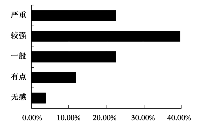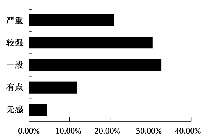 1) LED广告屏光侵扰影响程度 根据问卷所获数据,居民大多认为受到LED广告屏的光侵扰影响。认为LED广告屏“较强”和“严重”干扰其生活的居民占51%,仅4%对LED广告屏产生的光侵扰“无感觉”(见图 1)。对于LED广告屏的刺眼程度方面,认为广告屏刺眼程度为“较强”和“严重”的居民比例达62%(见图 2)。以上数据说明,大部分居民认为其居住周围的LED广告屏亮度太高,感觉很刺眼,并形成了较强侵扰。