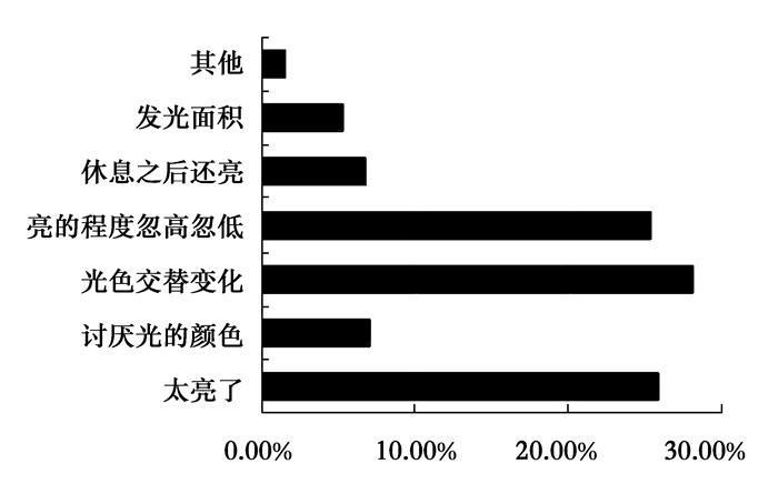 2) LED广告屏形成的侵扰因素 问卷统计结果显示,28%的居民认为LED广告屏“光色交替变化”最影响其生活(见图 3) ,其次为“太亮了”、“亮的程度忽高忽低”,分别占26%,25%;选择“讨厌光的颜色”及“休息之后还亮”两选项的居民均占7%,有5%的居民认为由于“广告屏发光面积太大”对其构成了影响。由此可见,光色交替变化、高亮度及其数值变化构成了LED广告屏干扰居民生活的主要原因。