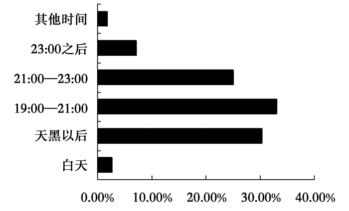 3) LED广告屏光侵扰的时间段 统计数据如图 4所示,大部分居民受到LED广告屏光侵扰的时间段为从天黑到23:00。这一时段居民正进行学习工作、休闲娱乐或睡眠休息等活动,很容易受到LED侵扰光侵扰。因此,应考虑周围居民作息,控制LED广告屏开启和关闭时间。