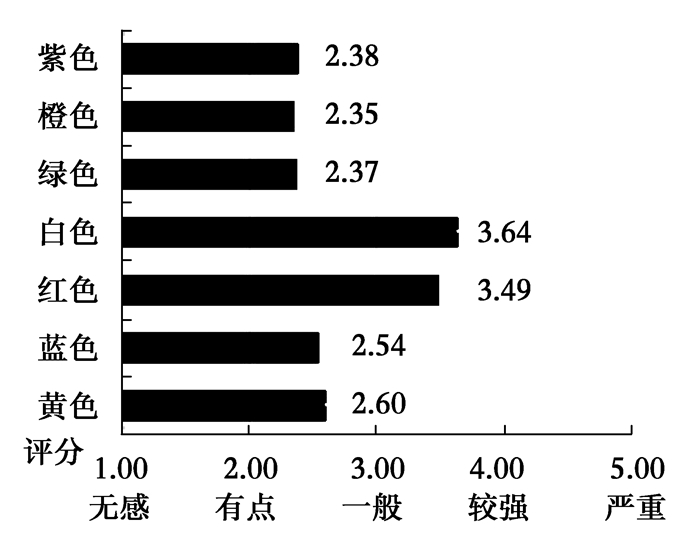 4) 居民对LED广告屏播放画面的颜色厌烦程度 经统计,如图 5所示,居民对白色最厌烦,其次为红色、黄色、蓝色。从整体来看,居民对白色、红色、橙色、黄色、绿色、蓝色、紫色这7种颜色的厌烦程度均处于2~4分之间,数据表明居民对带有一定亮度的色光都会产生厌烦。同时也反映出居民对红色、黄色、蓝色3种色光厌烦程度要高于其他色光。