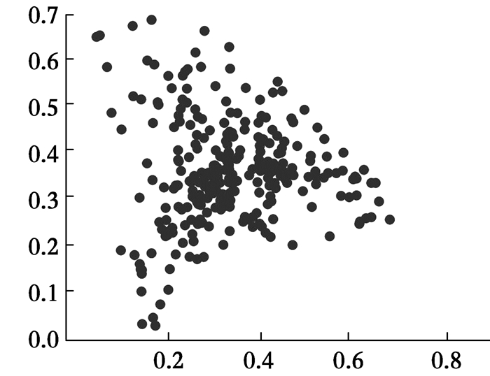 将现场测试获取的288组LED广告屏侵扰光色坐标绘制如图 8所示,将数据坐标值转化为色光波长,各色光所占比例见表 5。其中,绿色侵扰色光最多,占36.8%;红色侵扰光最少,仅占2.4%。