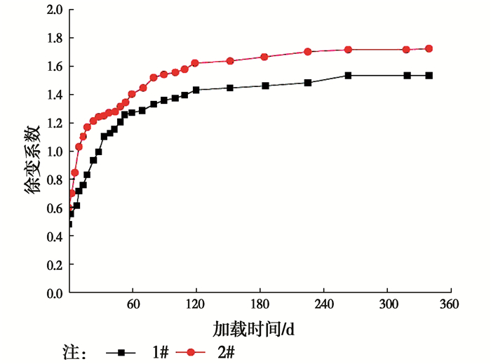 2个试件的徐变系数发展情况如图 1所示。由试验结果可知,徐变的早期发展速率较快,1#试件在28 d龄期的徐变系数为0.843,2#试件为0.998,均约占最终徐变发展的60%。在30~240 d间,试件的徐变仍平稳增长,但发展速率逐渐减缓,两试件在250 d的徐变系数分别为1.481及1.684。在240 d之后,试件的徐变发展均趋于迟缓。