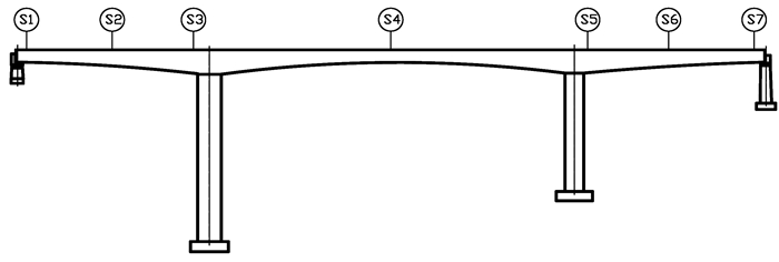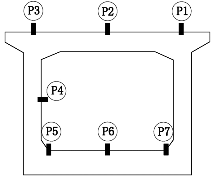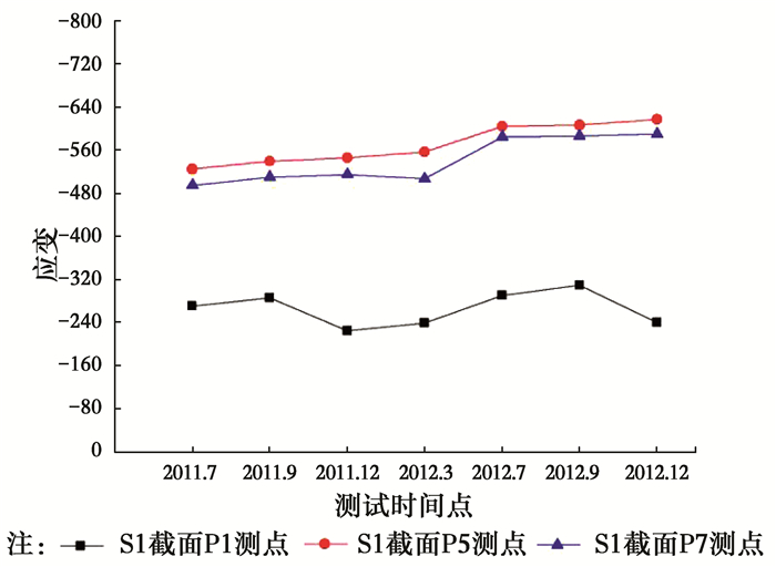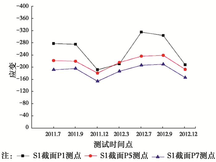 自2011年7月起,历时约为3 a,对牛角坪大桥进行了长期的观测工作,采集了包括徐变效应在内的大量实测数据,本文提取了7个时间点:2011年7月、2011年9月、2011年12月、2012年3月、2012年7月、2012年9月、2012年12月的实测数据进行分析。根据徐变在早期增长较快,后期逐渐平缓的发展规律,故在实际的测量工作中,测量频率随时间而逐步减少,每次的观测时长为3 d左右,先后对其进行10次左右的实测工作。该桥取7个控制截面进行观测,具体布置位置如图 1所示,考虑到牛角坪大桥为三跨刚构桥,从工程角度考虑,选取了截面面积最小及最大处,即合龙段(S1,S7),以及左右两跨根部截面(S3,S5)。布置了边跨及主跨跨中位置(S2,S4,S6)。截面应变采用震弦式传感器进行测量,相应的测点布置如图 3。