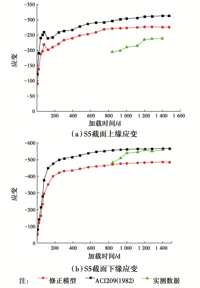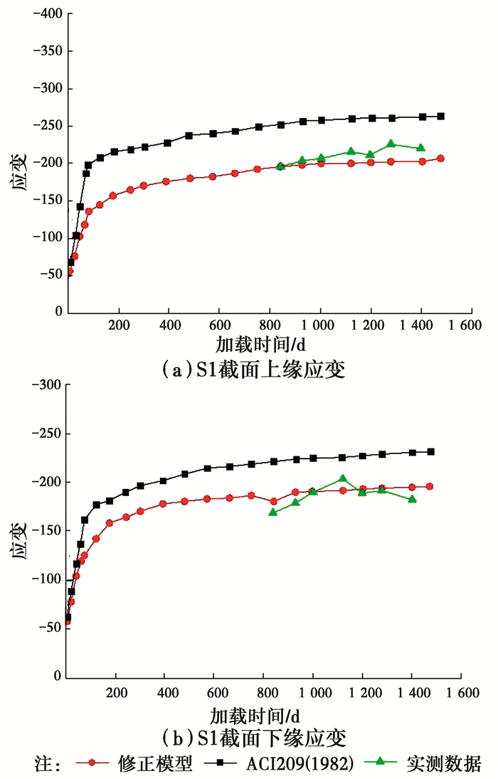 根据所编写的ABAQUS脚本构建实桥模型,用上述两种模型对徐变值进行预测。根据气象资料,当地湿度在全年之中的波动不大,对预测值的影响很小,故统一取平均湿度70%进行计算。实测数据受季节影响很大,主要是温度的影响,故采用温度补偿的方式对实测数据进行修正。即计算该桥合龙时与实测时的温差,在此基础上得出相应的温度对于应变测量结果的影响系数,以修正实测数据。考虑了实测补偿值的实测数据,减小了温度对徐变计算的影响,使得其呈现出更好的发展规律,因而与模拟计算的结果更具可比性。根据所得的分析结果绘制成图,S1截面及S5截面的结果如图 6所示。