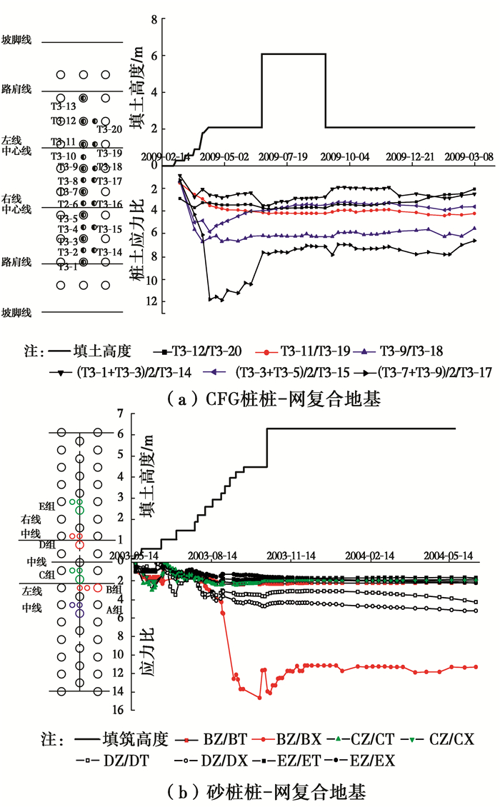 2) 受桩刚度差异的影响,桩土应力比变化规律存在较大差异,CFG桩-网桩土应力比随着路堤填筑加载而增大,最终稳定在4.2左右,其荷载分担比达到50%左右;而砂桩-网桩土应力比随荷载增加先增大后减小再增大,呈波浪形变化,最终稳定后约为3.5,其荷载分担比约17.9%。在中低压缩性地基土中,砂桩较CFG桩更能在较短时间内使桩土应力比稳定。