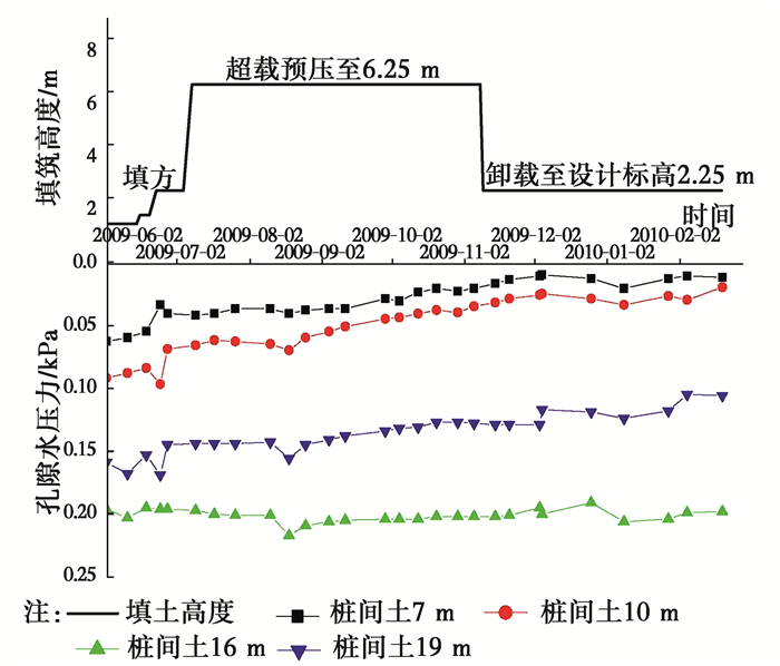 图 6为不同深度处CFG桩-网复合地基超静孔隙水压力随时间荷载的变化规律,从总体上看,埋设深度对超静孔压变化影响不大,但上部荷载对超静孔压变化有一定影响,超静孔压随荷载增加而略微增大,到恒载期超静孔压逐渐消散。且在恒载期较深测点处的超静孔压值有所降低,说明孔隙水自上而下渗流,土体逐渐固结,卸载至设计标高后超静孔压继续减小。桩底16 m处测点的孔压最大,下卧层次之,桩间土的孔压相对较小。