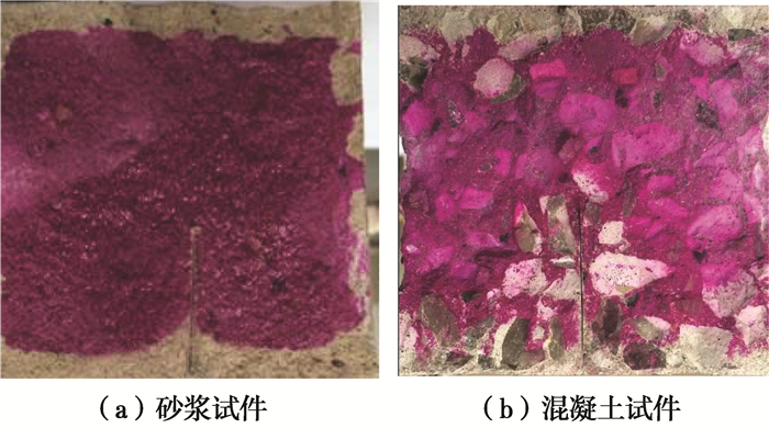 依据《普通混凝土长期性能和耐久性能试验方法标准》(GB/T 50082—2009),对各试件进行加速碳化试验,在碳化箱内(湿度为70±5%)碳化至3、7、14 d时,取出试件,垂直于裂缝面切开,在切开面上喷洒质量分数1%酚酞酒精溶液,经30 s后,测量碳化深度。水灰比为0.6,碳化至14 d的单缝砂浆试件碳化图如图 1(a)所示,裂缝宽度0.3 mm,深度60 mm,碳化至14 d的混凝土试件碳化图如图 1(b)所示。