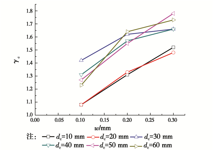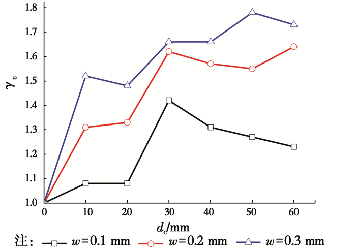 因裂缝内部几乎无空气流动,且由于裂缝壁的吸附作用,水分子较难扩散到外界空气中,裂缝内的水分汽化比混凝土表面的水分汽化慢[12]。在混凝土中孔隙水不断蒸发情况下,裂缝内保持较高相对湿度,甚至达到100%,在裂缝开口位置,因与外界环境的蒸气压差会形成湿度梯度。当环境相对湿度在50%~70%时,混凝土碳化速度最大,在当环境相对湿度接近100%时,混凝土碳化几乎停止[13-14]。因此,存在一个临界裂缝深度d0,当dc<d0时,γc随着dc增加,当dc≥d0时γc变化量很小,视为定值。由图 3可知,当dc<30 mm时,γc随着dc以二次函数增加;当dc≥30 mm时,γc变化量较小。即在本试验条件下d0=30 mm。且当0.1 mm≤w≤0.3 mm时,w对d0影响不大。