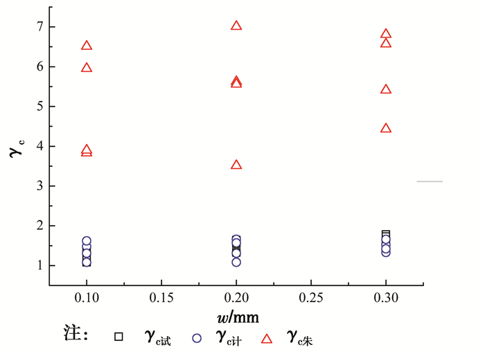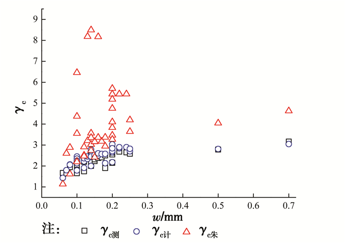 3) 试验裂缝宽度范围为0.1~0.3 mm,工程实例裂缝宽度范围为0.06~0.7 mm,但提出的计算模型γc计算值与试验实测值和工程实例实测值均吻合较好,模型裂缝宽度范围为0.06~0.7 mm。
