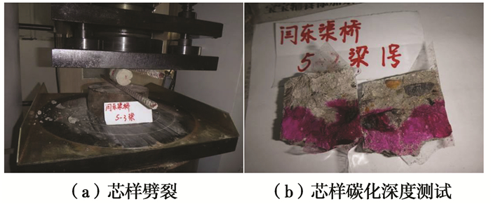 在裂缝位置及相同环境条件下同一片梁非裂缝位置借助内径为5 cm的钻芯机钻取芯样,裂缝位置芯样钻取的长度大于超声波法测出的裂缝深度值,非裂缝位置芯样钻取5~10 cm。将芯样上下各垫一根钢筋,在压力试验机上劈裂,其中带裂缝芯样垂直于裂缝劈裂,如图 5(a)所示。劈裂前,可在两侧粘贴胶带,防止出现所取芯样强度低、骨料过多导致芯样碎裂、难以拼装等问题。将芯样劈裂后,进行碳化深度测量,方法同第2节。芯样测试情况如图 5(b)所示。根据本文模型及朱元祥模型,对各条裂缝的γc值进行计算,并与实测值进行对比,见表 6。