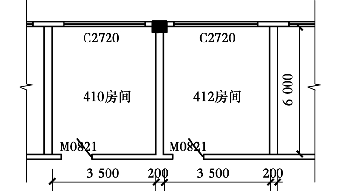 实验在重庆大学辐射供暖实验平台进行,实验对象是如图 1所示两间相同房间,410房间、412房间,每个房间面积为21 m2,房间尺寸为6 000 mm×3 500 mm×2 700 mm(长×宽×高), 门尺寸为800 mm×2 100 mm(宽×高),外窗尺寸为2 700 mm×2 000 mm(宽×高);窗户为铝合金单层窗,玻璃厚度为6 mm,内敷设蓝色厚窗帘;建筑外墙为240 mm的实心砖墙(未做保温),内墙为200 mm厚的实心砖墙,室内未布置任何家具。